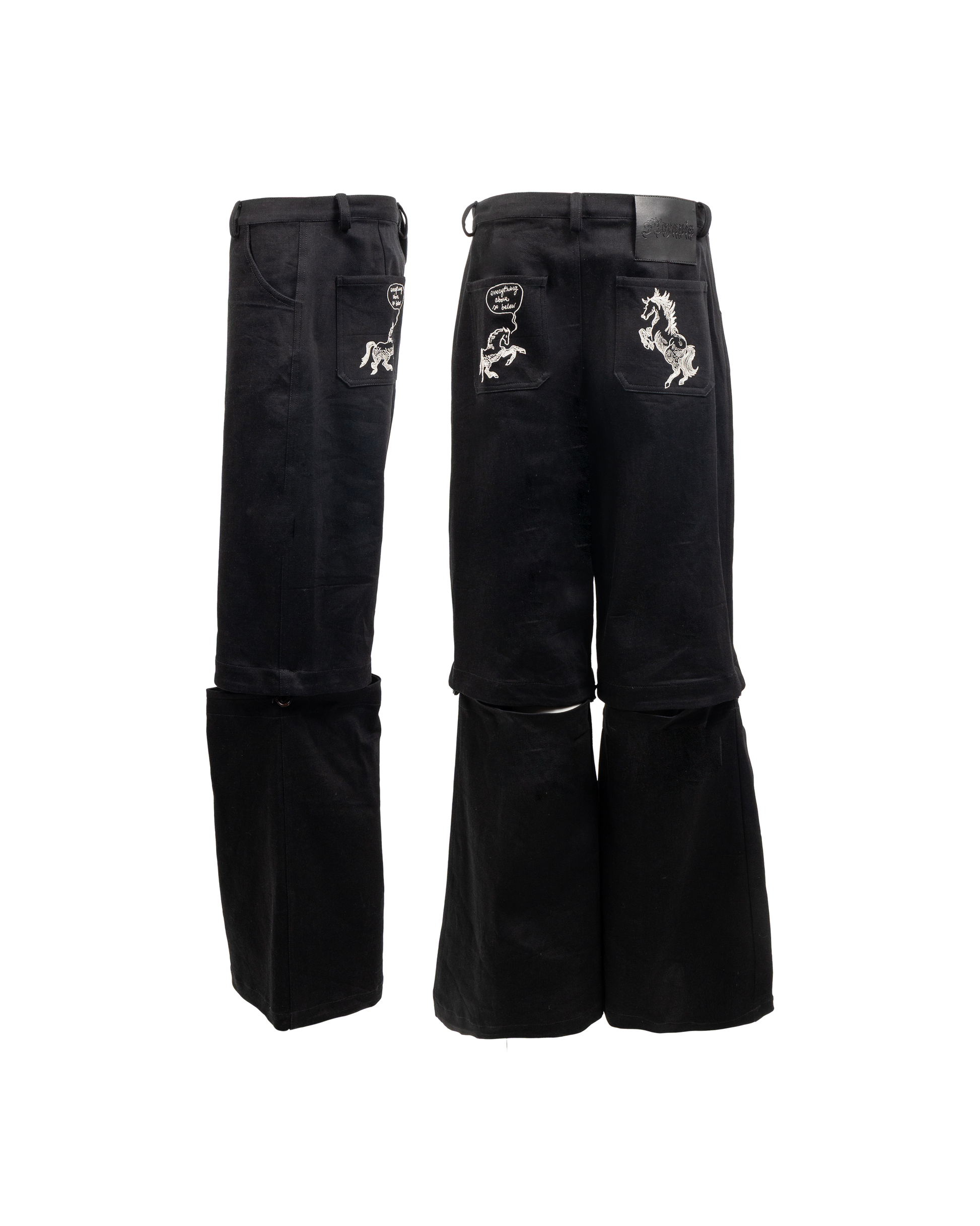 Detachable leg 'Alchemy' trousers in high quality cotton. Embroidered in the back with original Florania designs. In stock or made to order.ย