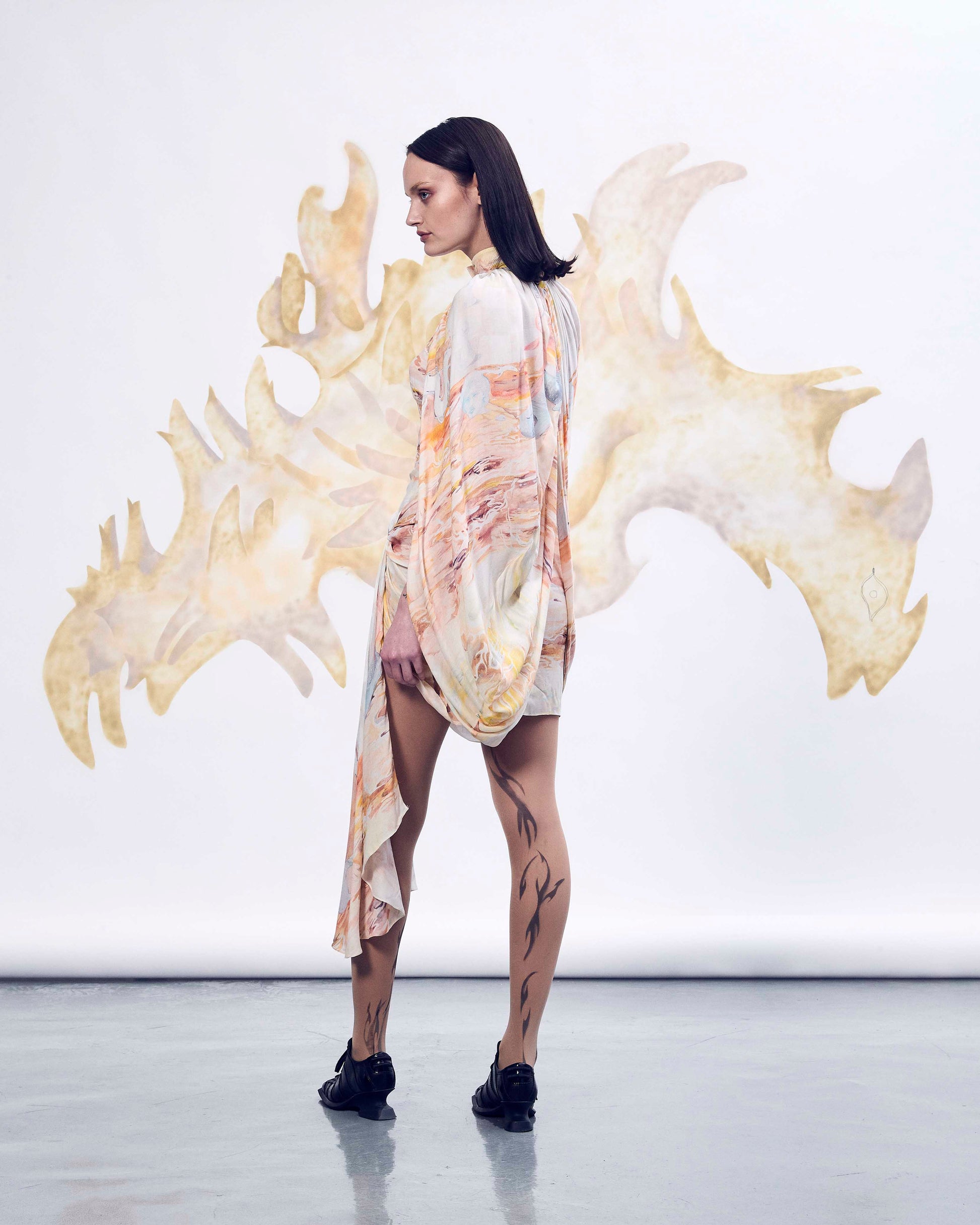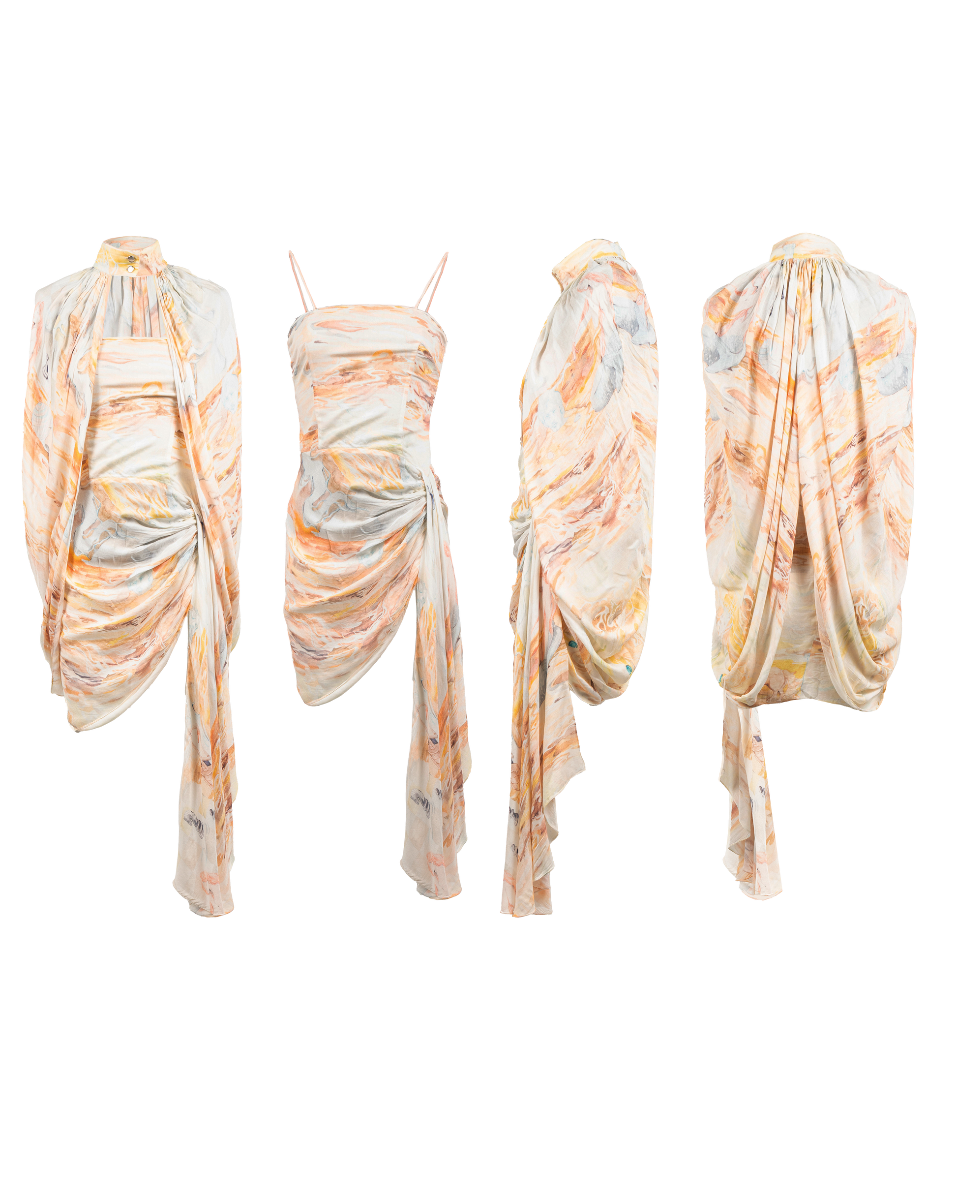 Printed deconstructed strings dress with detachable cape and hand-draped skirt. Custom-made in our Milan atelier, using locally sourced materials and crafted through artisanal processes. Printed with low-impact technology, with original Florania's watercolors designs. 100% viscose locally sourced.