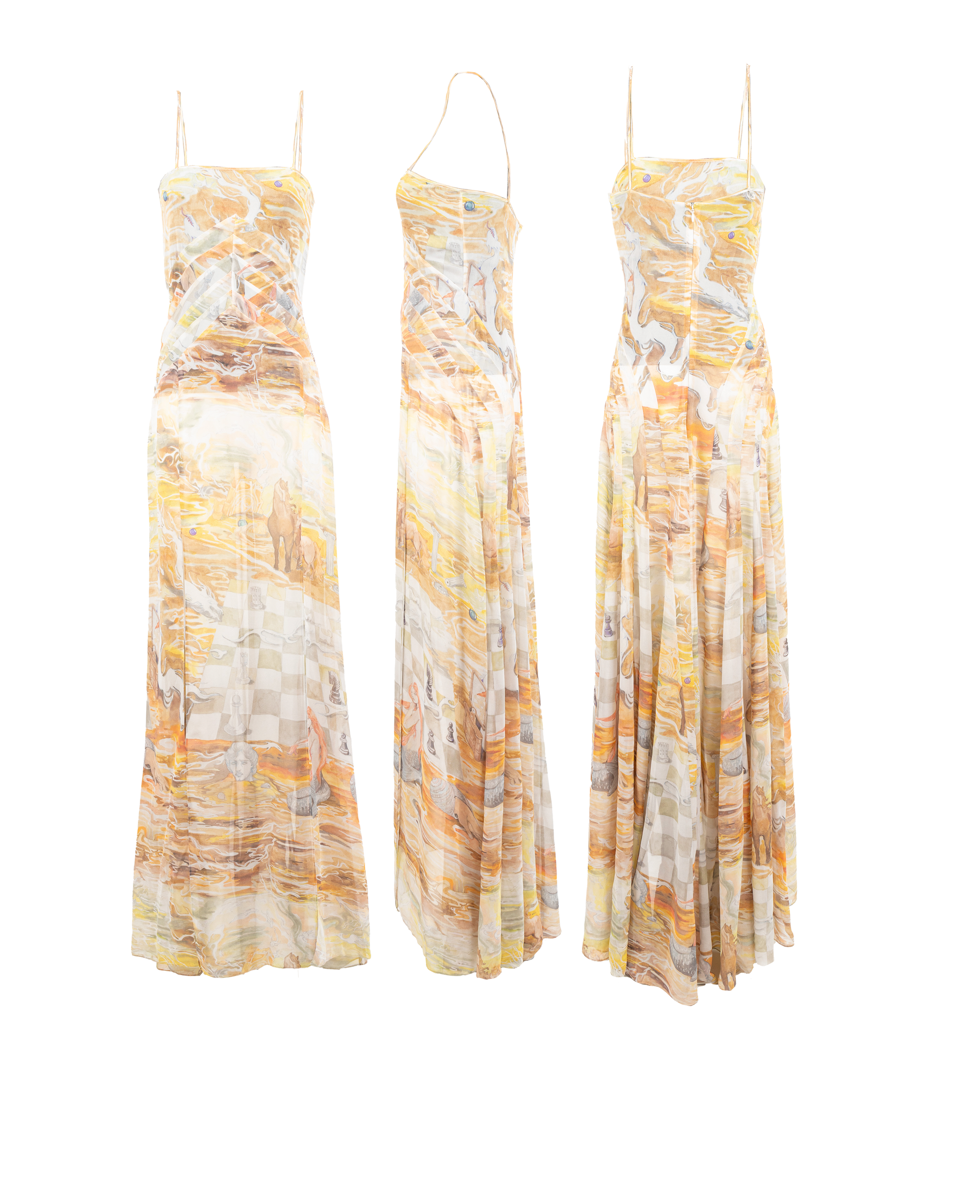 Printed strings dress with paneled sides and leg openings. Original Florania's Surrealist watercolors designs. Custom made in our Atelier in Milano. Locally sourced and crafted. Viscose and polyester blend.ย