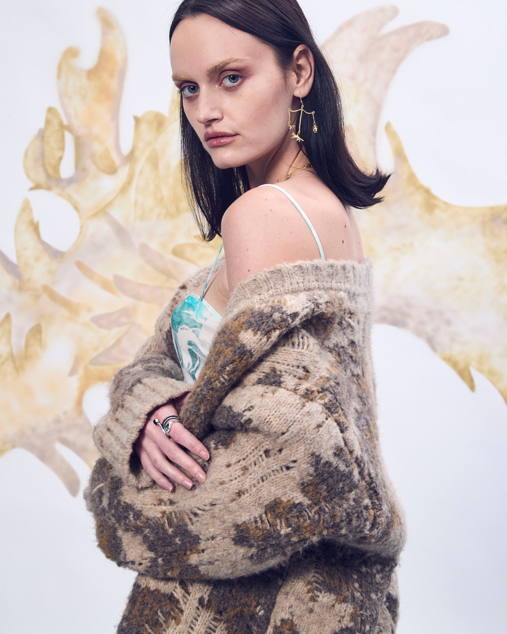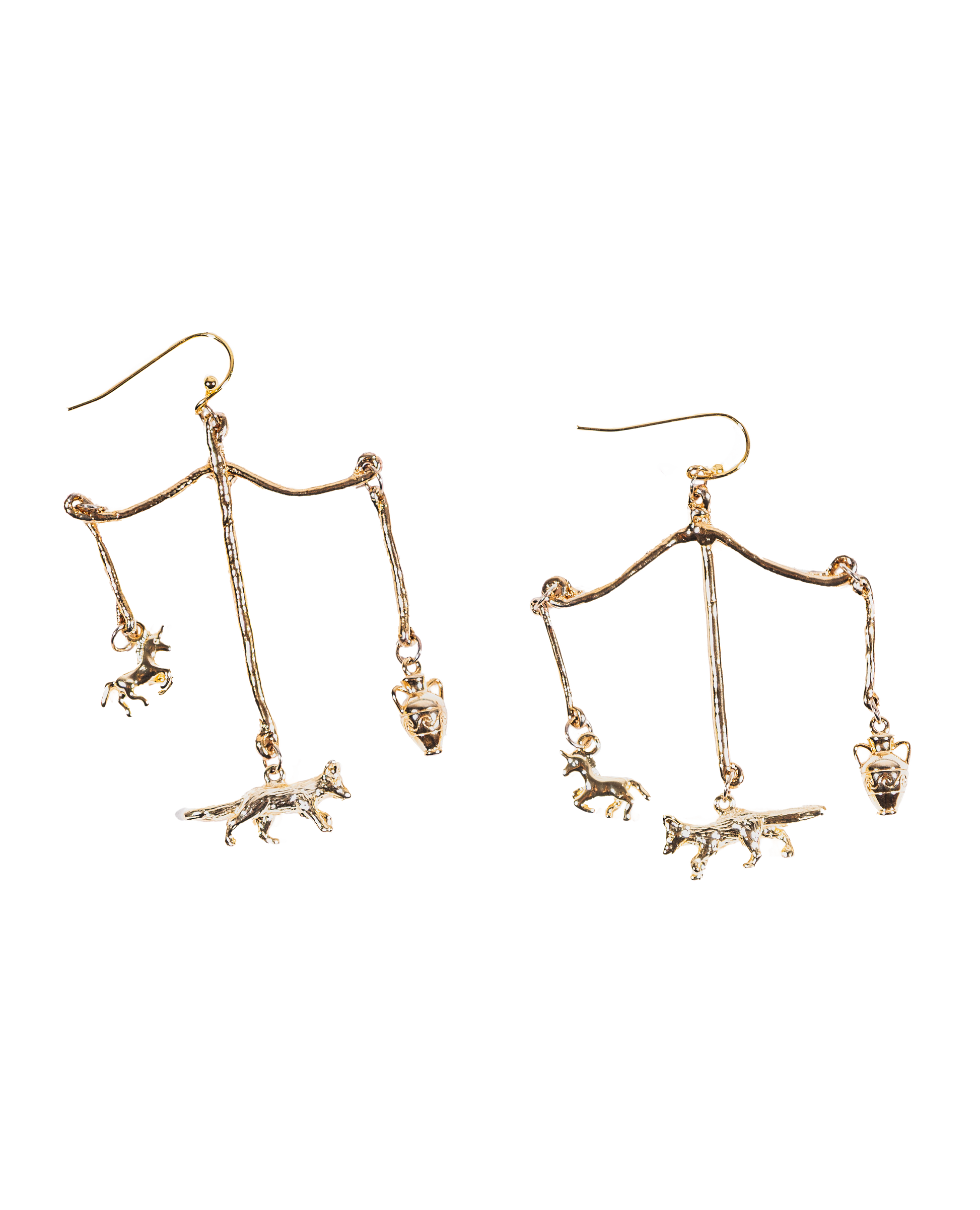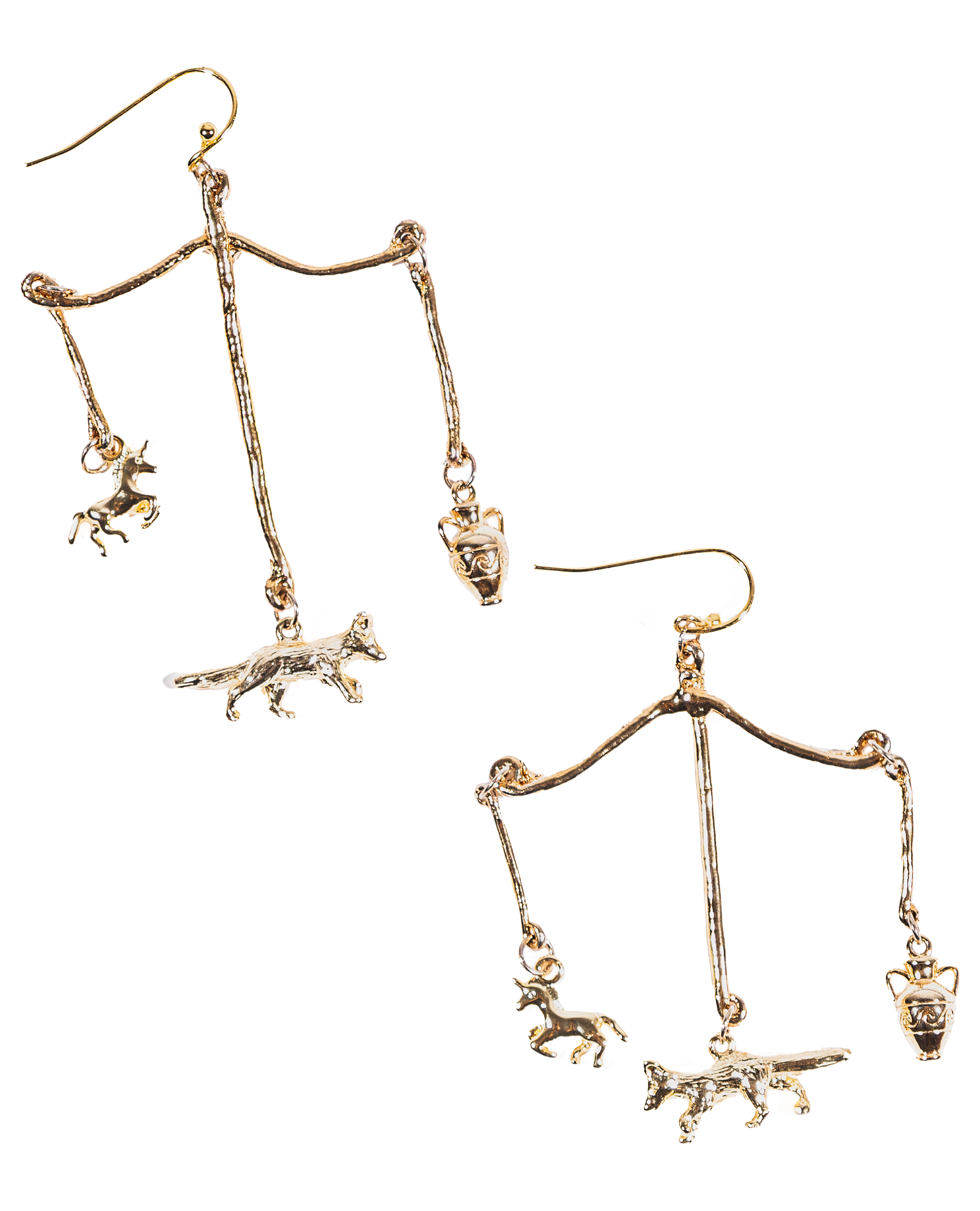 A pair of amulets earrings with fox, anphora and unicorn, inspired by ancient talismans and Fantasy litterature. Each piece is slowly crafted in Italy, cast in bronze and plated with 18ct gold.