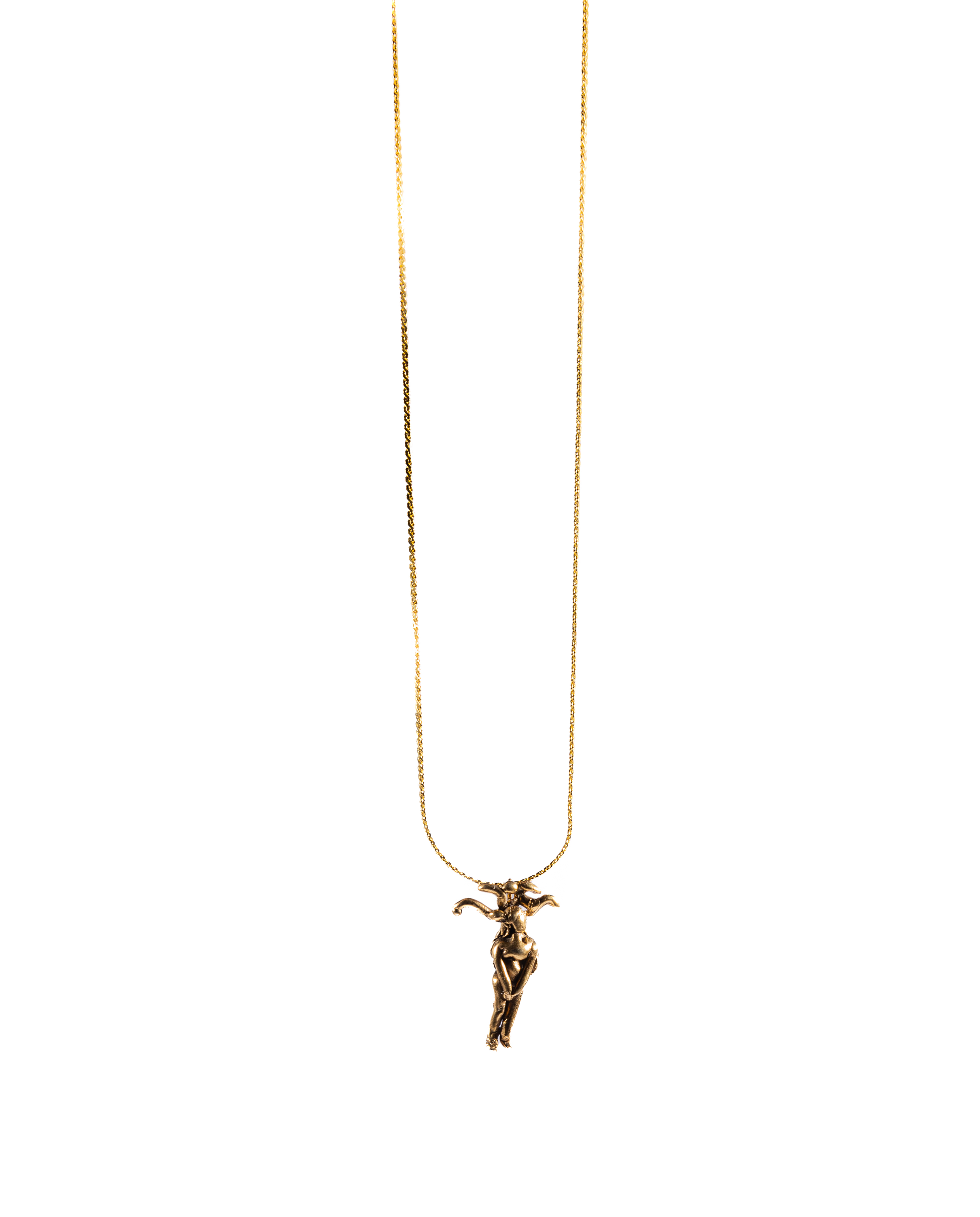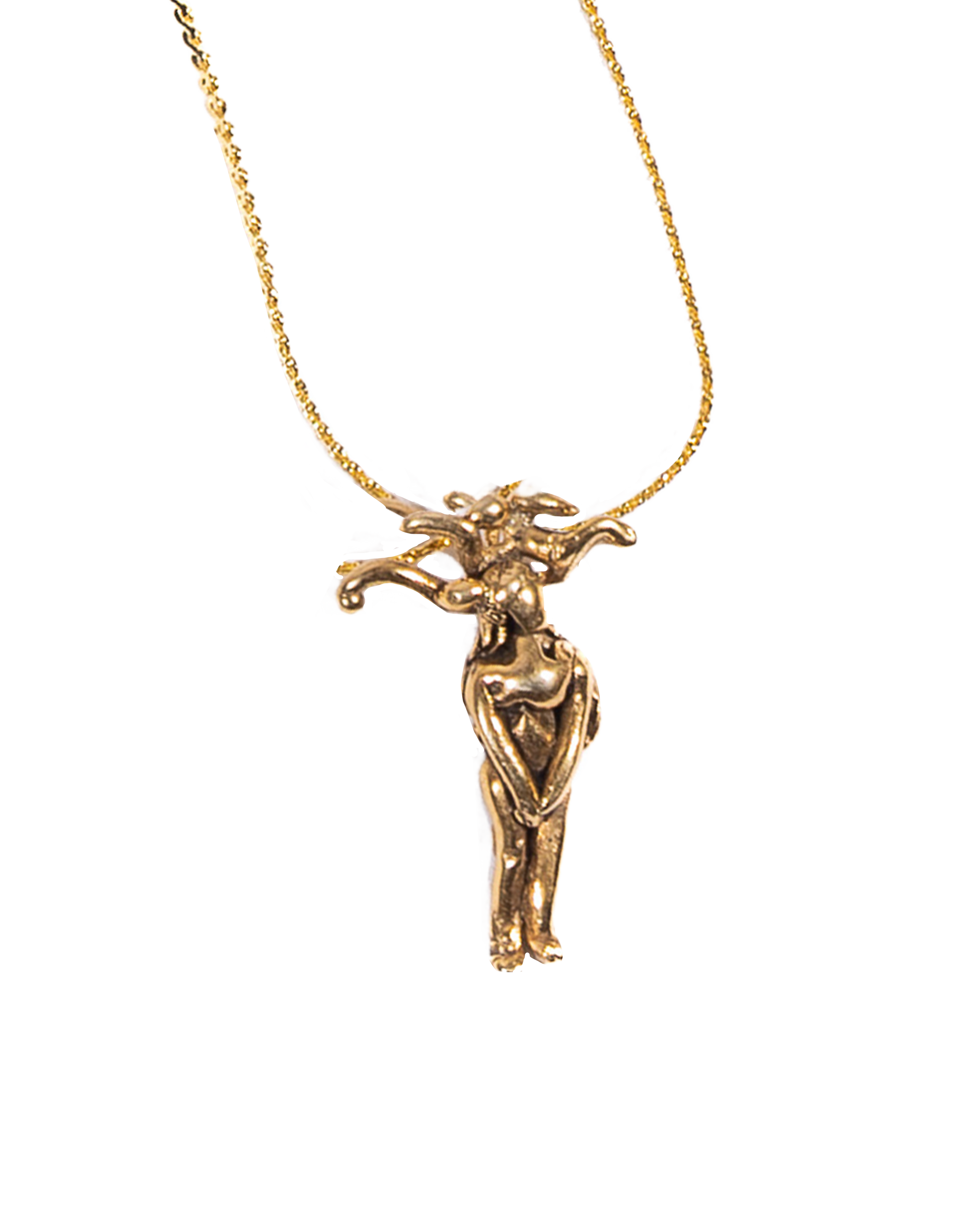 Thin chain collier with golden Mandrake pendant, inspired by ancient talismans and Fantasy litterature. Each piece is slowly crafted in Italy, cast in bronze and plated with 18ct gold.