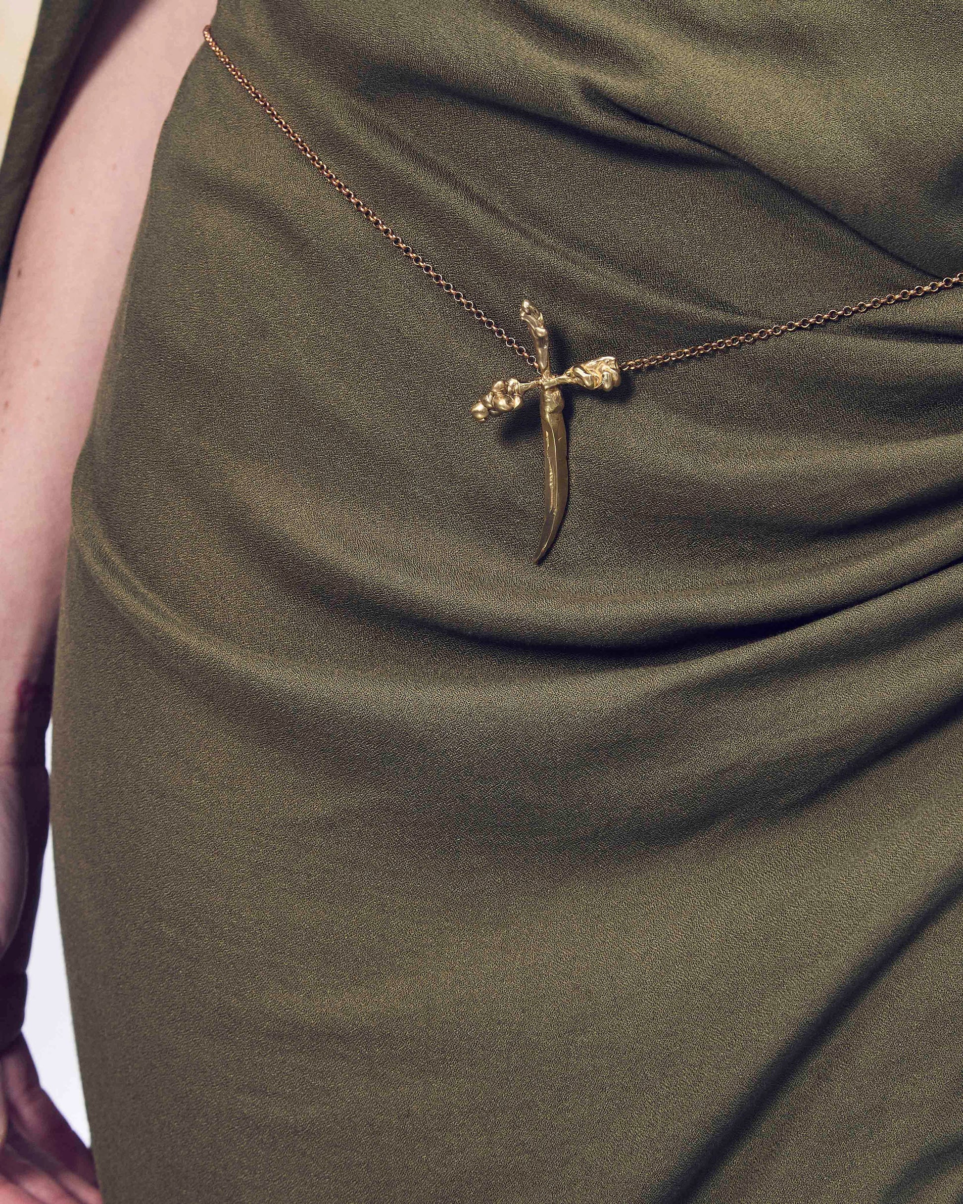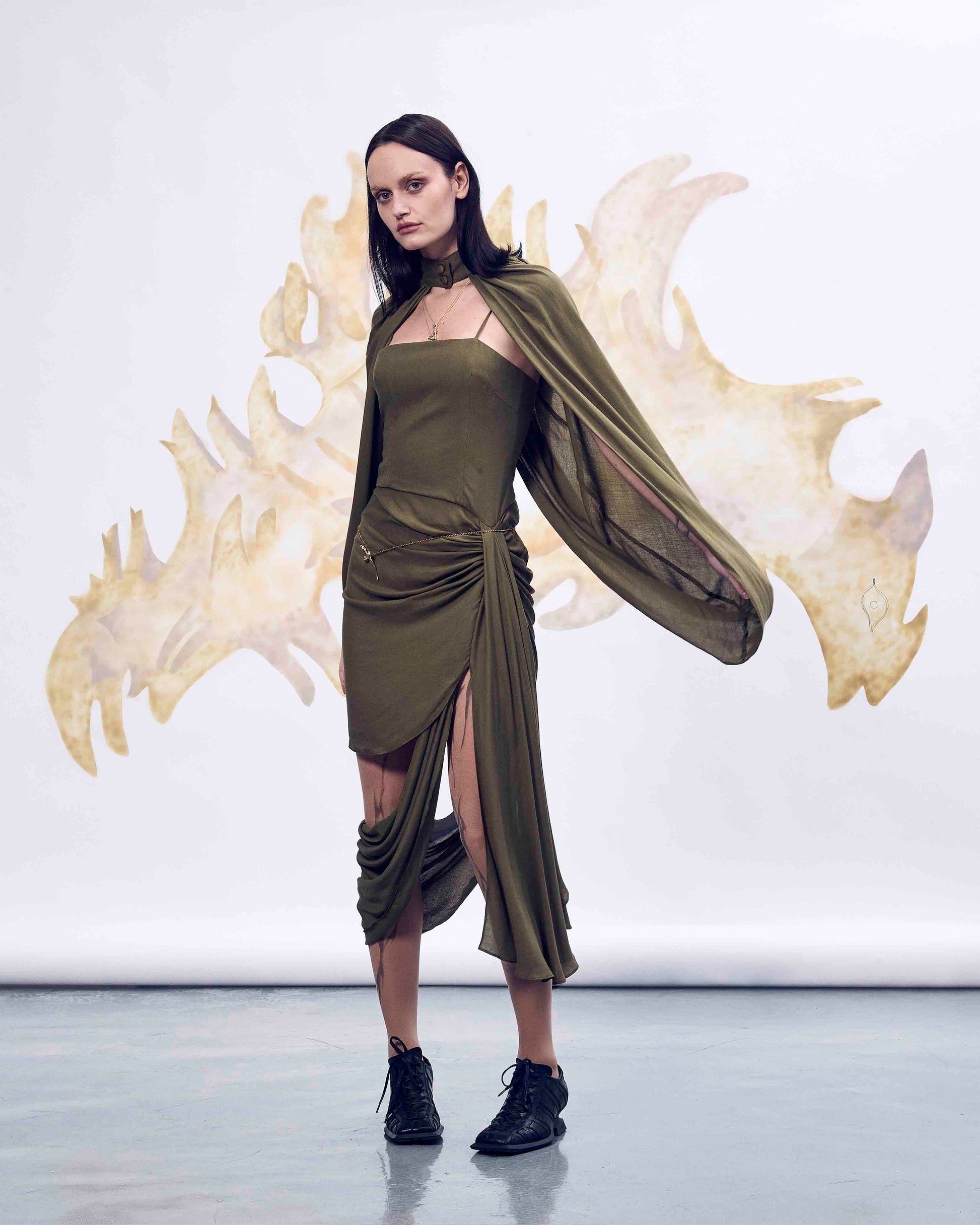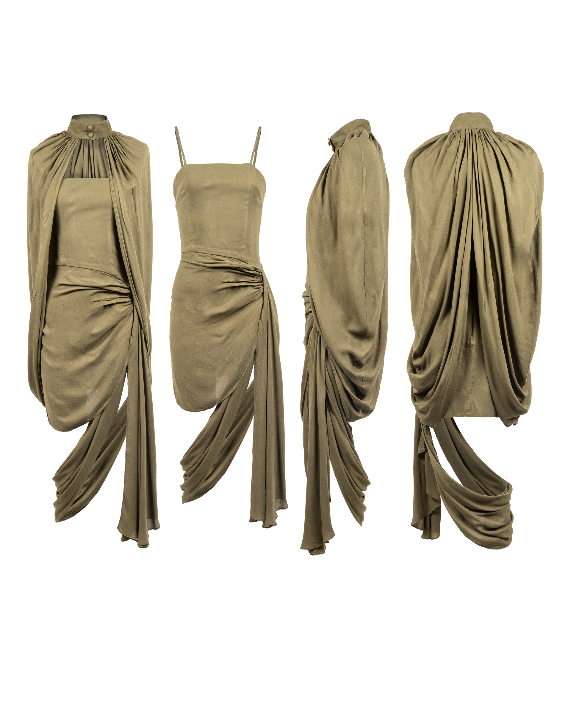 Olive deconstructed strings dress with detachable cape and hand-draped skirt. Custom-made in our Milan atelier, using locally sourced materials and crafted through artisanal processes. 100% viscose locally sourced. Soft fit.Β