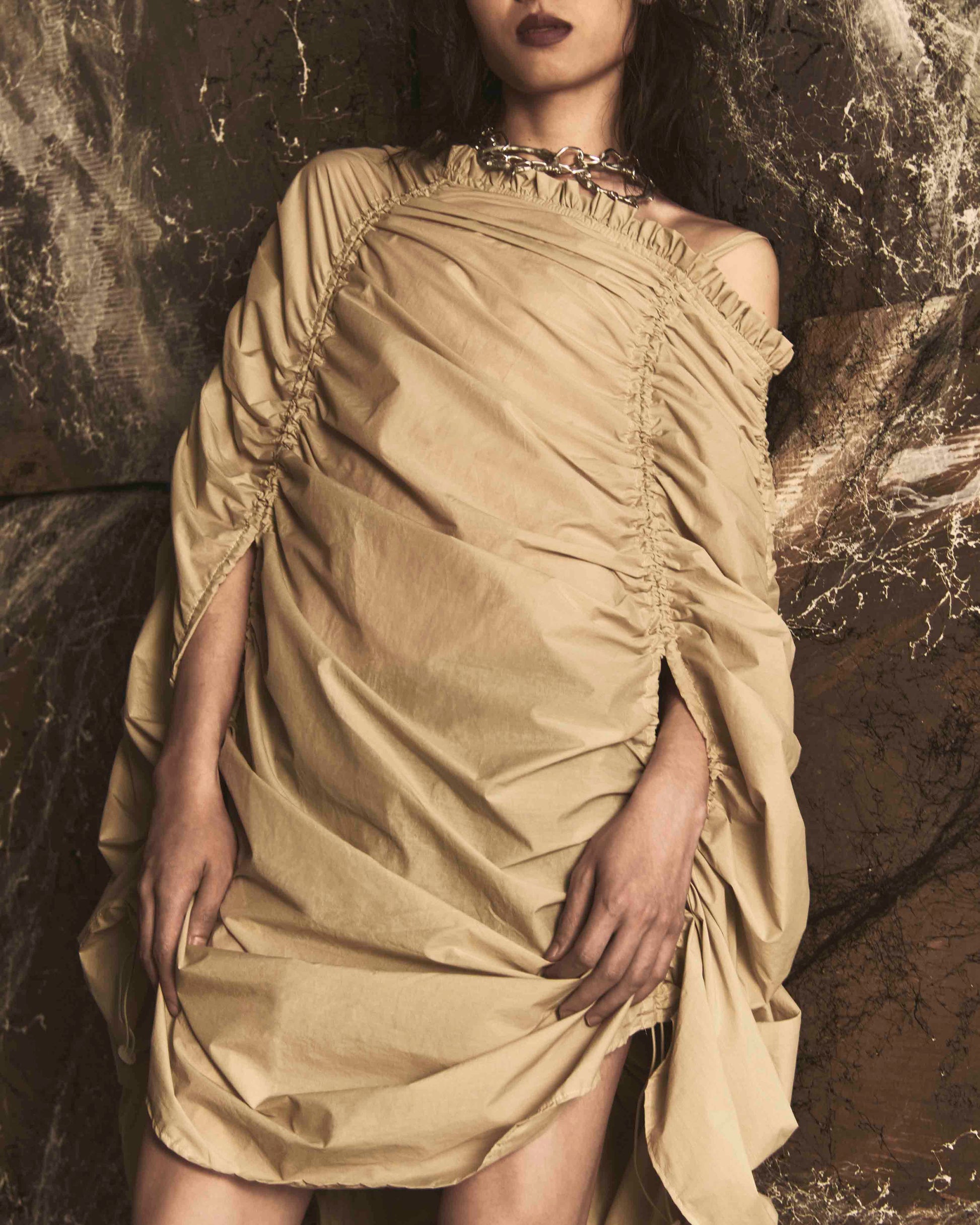 Parachute draped cape dress, transformable into a skirt. Handcrafted in Italy with recycled nylon and cotton blend or cotton with coffee grounds.
